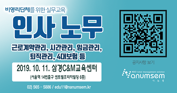 s 나눔셈에서는 비영리단체에서 노동관련 법령 및 인사노무 지식 부족으로 인하여 사업주와 근로자간의 불필요한 노사갈등을 사전예방하고 밝고 활기찬 조직문화 조성에 기여하기 위해 인사노무 실무교육을 진 진행하게 되었습니다. 개정된 노동법, 근로기준법에 대해 자세히 알고 싶은 단체는 “비영리단체를 위한 인사노무 실무교육"을 준비하였으니 실무자분들의 많은 참여 바랍니다.
