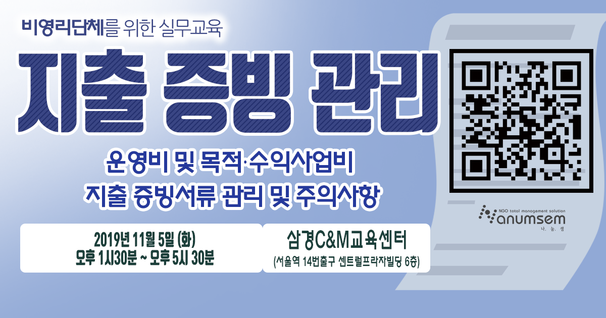 나눔셈에서는 세무·회계 실무자를 대상으로 비영리단체의 적법한 지출증빙 관리 교육을 실시합니다. 운영비 및 목적·수익사업비 지출 증빙서류 관리 및 주의사항에 대해 아래와 같이 교육을 준비하였으니, 실무자들의 많은 참여 바랍니다.