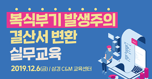 -아 래- - 교 육 명 : 복식부기 발생주의 결산서 변환 실무교육 - 강 사 : 공인회계사 최호윤 - 교 육 일 : 2019년 12월 6일 (금) - 시 간 : 오후 1시 30분~ 오후 5시30분 - 장 소 : 삼경C&M교육센터 6층 (서울역 14번출구 센트럴프라자빌딩) - 모집인원 : 총 60명(등록 선착순 마감) - 교 육 비 : 1인기준 50,000원(부가세 포함) - 입금계좌: 국민은행 349401-04-118797 (예금주 : 나눔과셈)